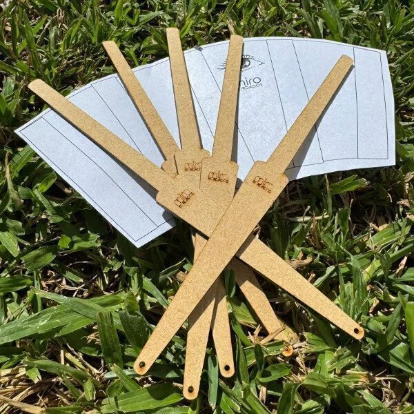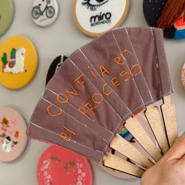Molde en PDF para coser a mano o máquina tu abanico. Incluye 5 maderitas que dan forma al abanico, ideal para proyectos personalizados. Recomendamos lavar la tela antes de usar el molde.